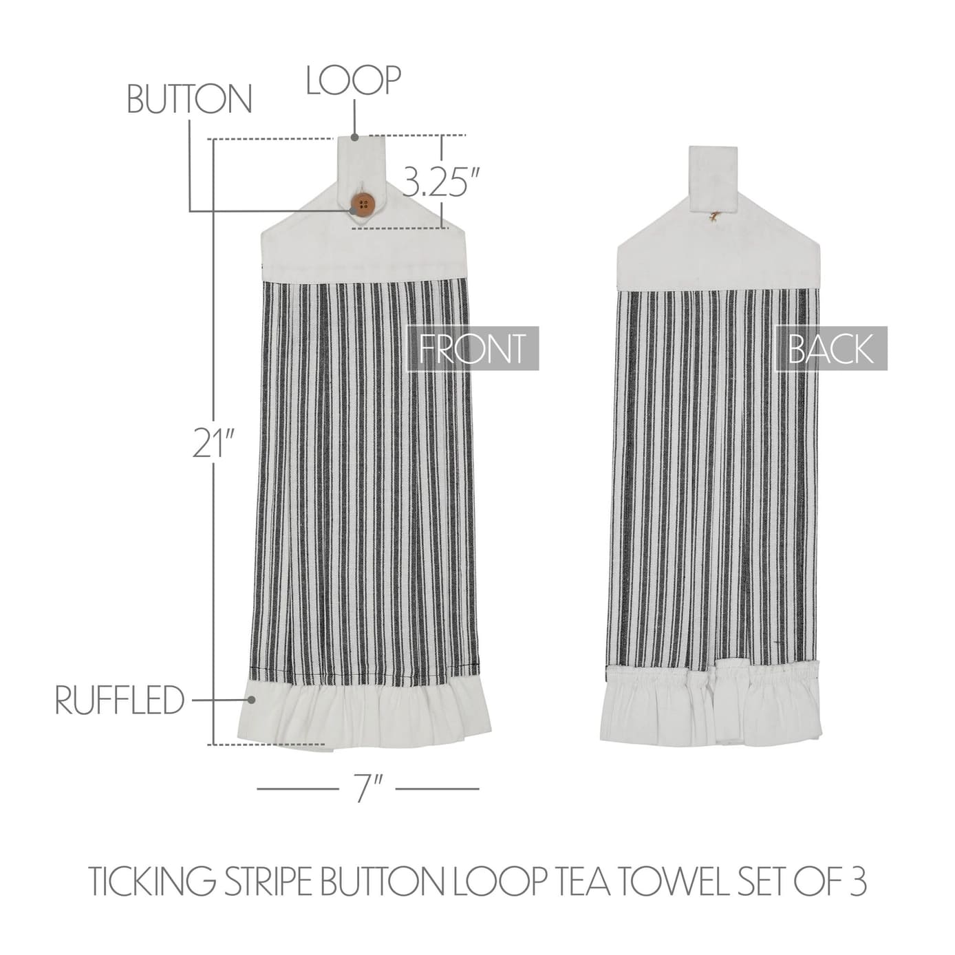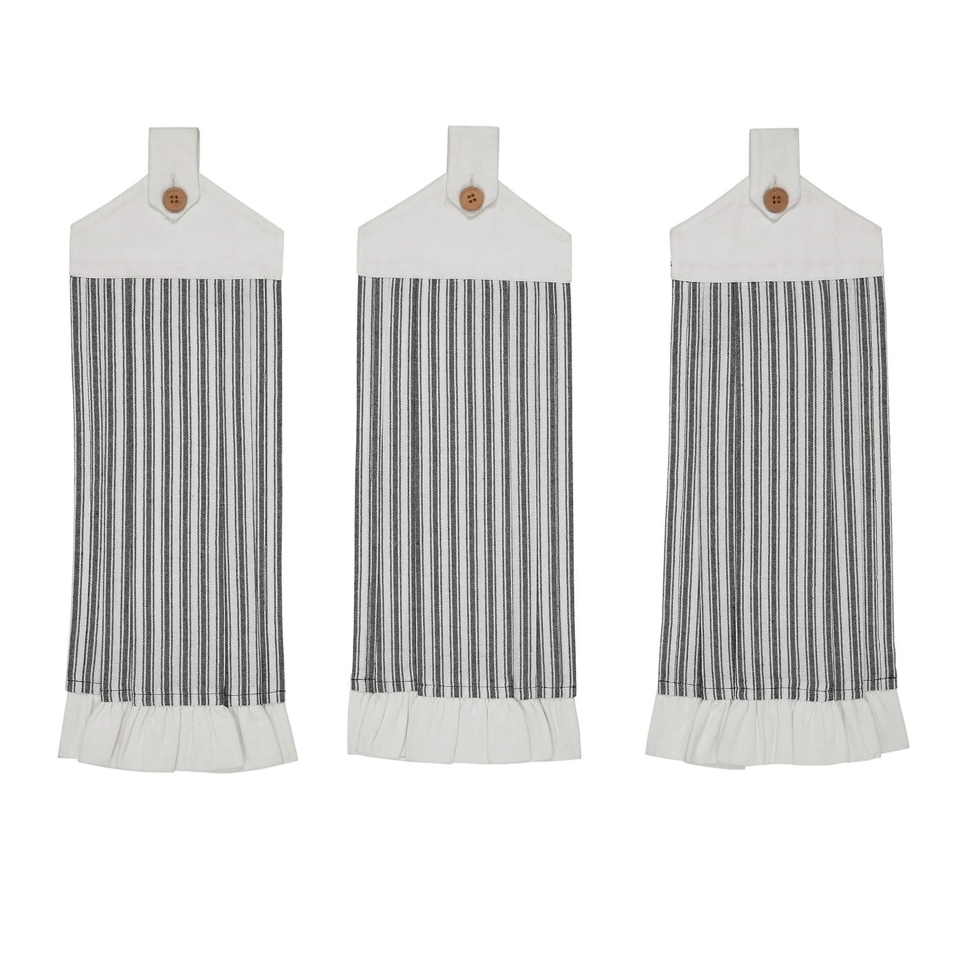 Bring rustic elegance to your kitchen with this set of three cotton towels. Featuring a classic black ticking stripe, pleated texture, and button loops for easy hanging, each 21″ x 7″ towel is both stylish and functional for drying, wiping, or decorating.