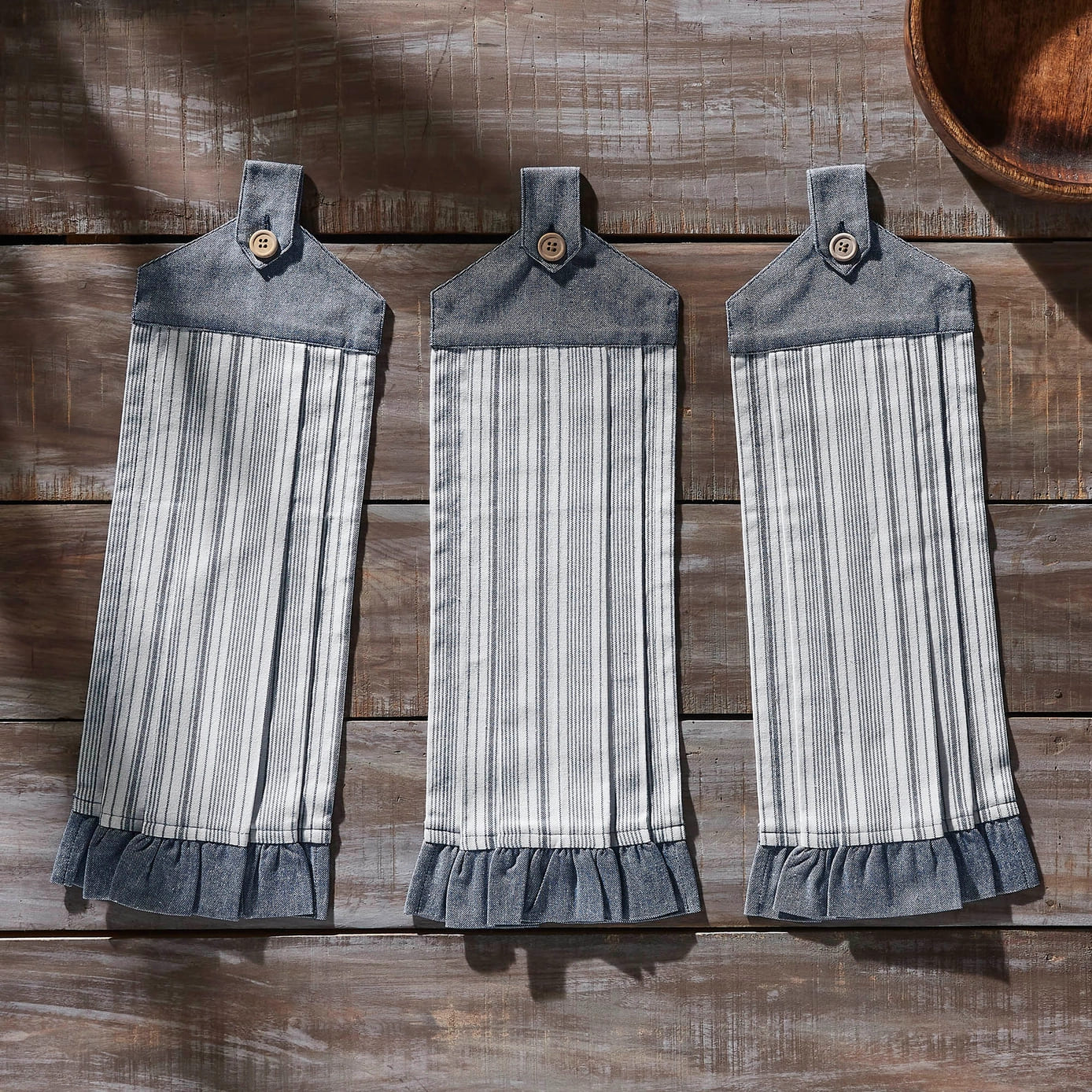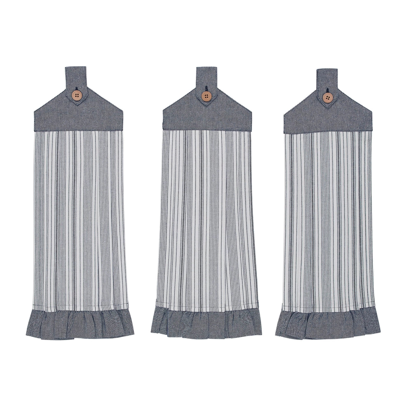 Add farmhouse charm with this set of three 100% cotton towels in classic blue ticking stripes. Each 21″ x 7″ towel features a textured weave and button loop for easy hanging, combining style and functionality for drying, wiping, or decorative use.