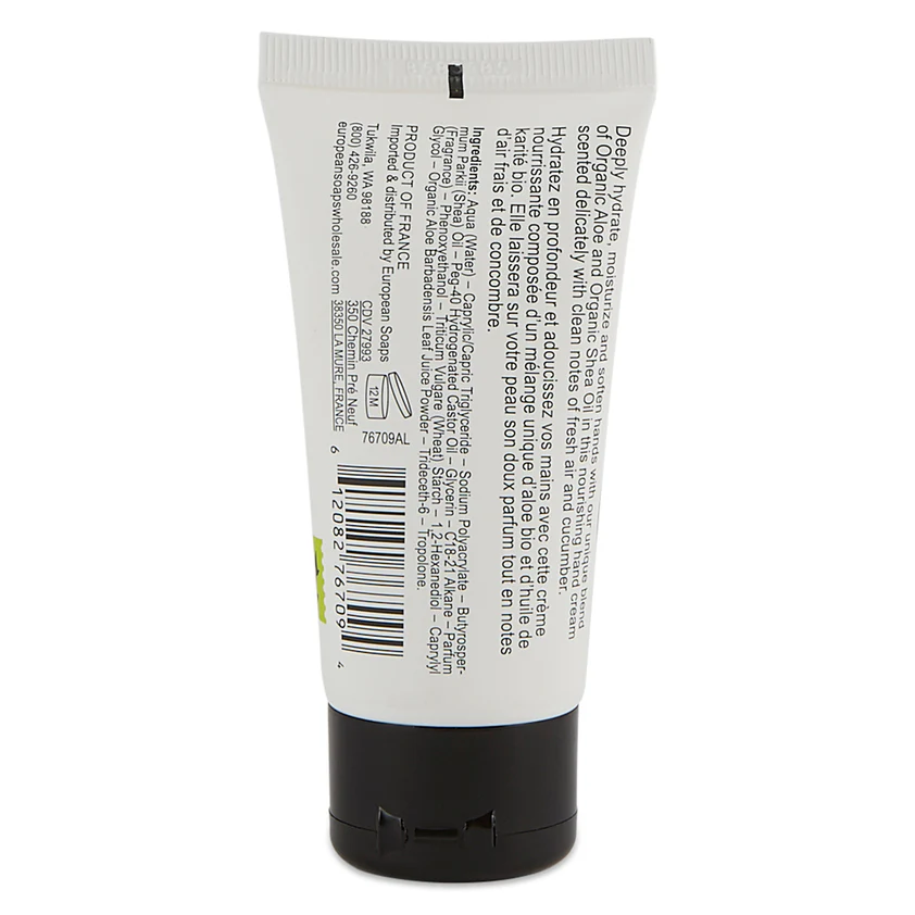 Hand Cream – Aloe Collection – 50ml Pre de Provence Aloe Hand Cream (50ml) is delicately scented with notes of fresh air and cucumber. Made with concentrated Organic Aloe. Aloe effectively removes residual impurities while hydrating, moisturizing, and refreshing skin. Deeply hydrate, moisturize and soften hands with our unique blend of Organic Aloe and Organic Shea Oil in this nourishing hand cream. Highly absorbent, non-greasy and lightweight.