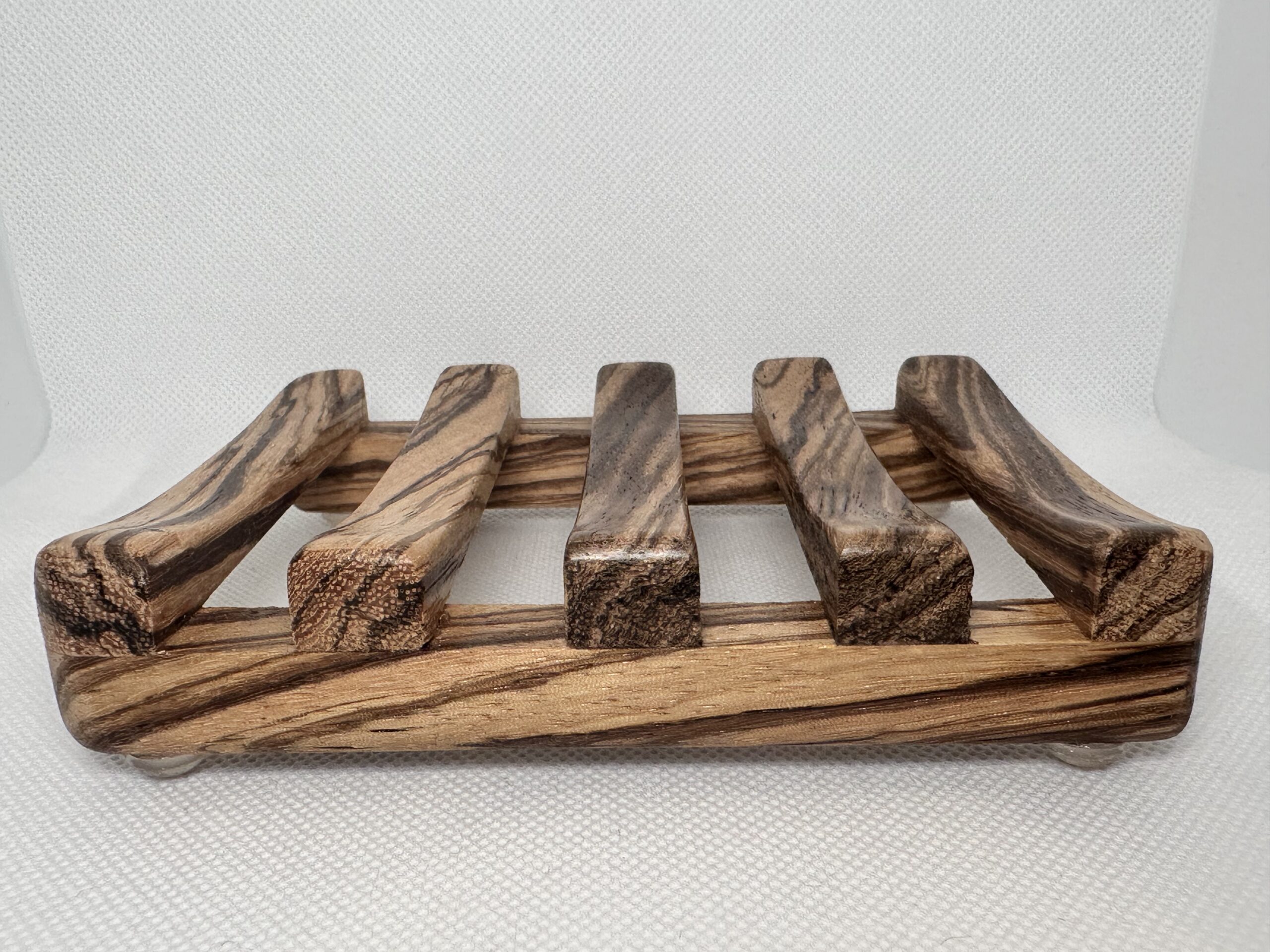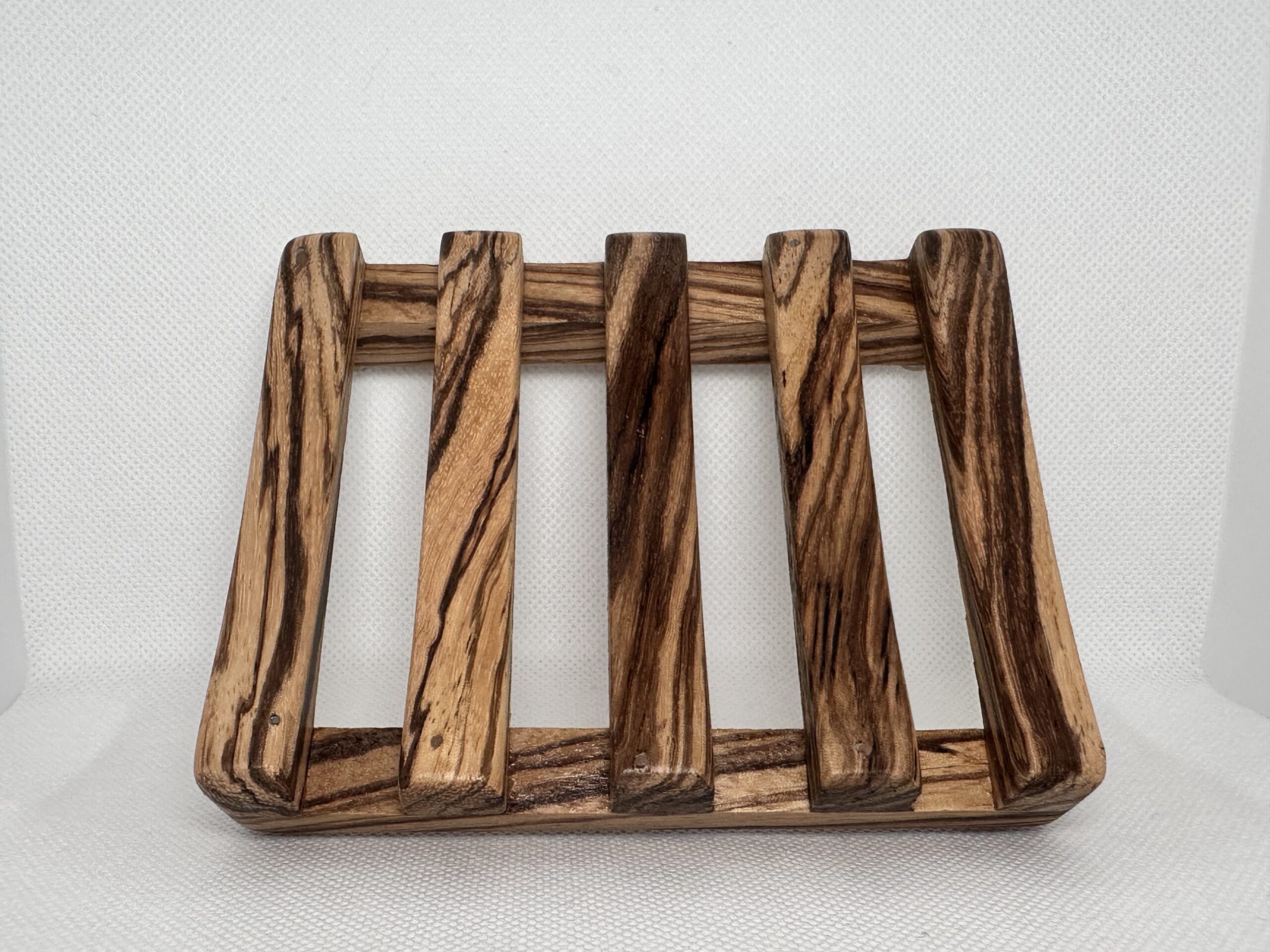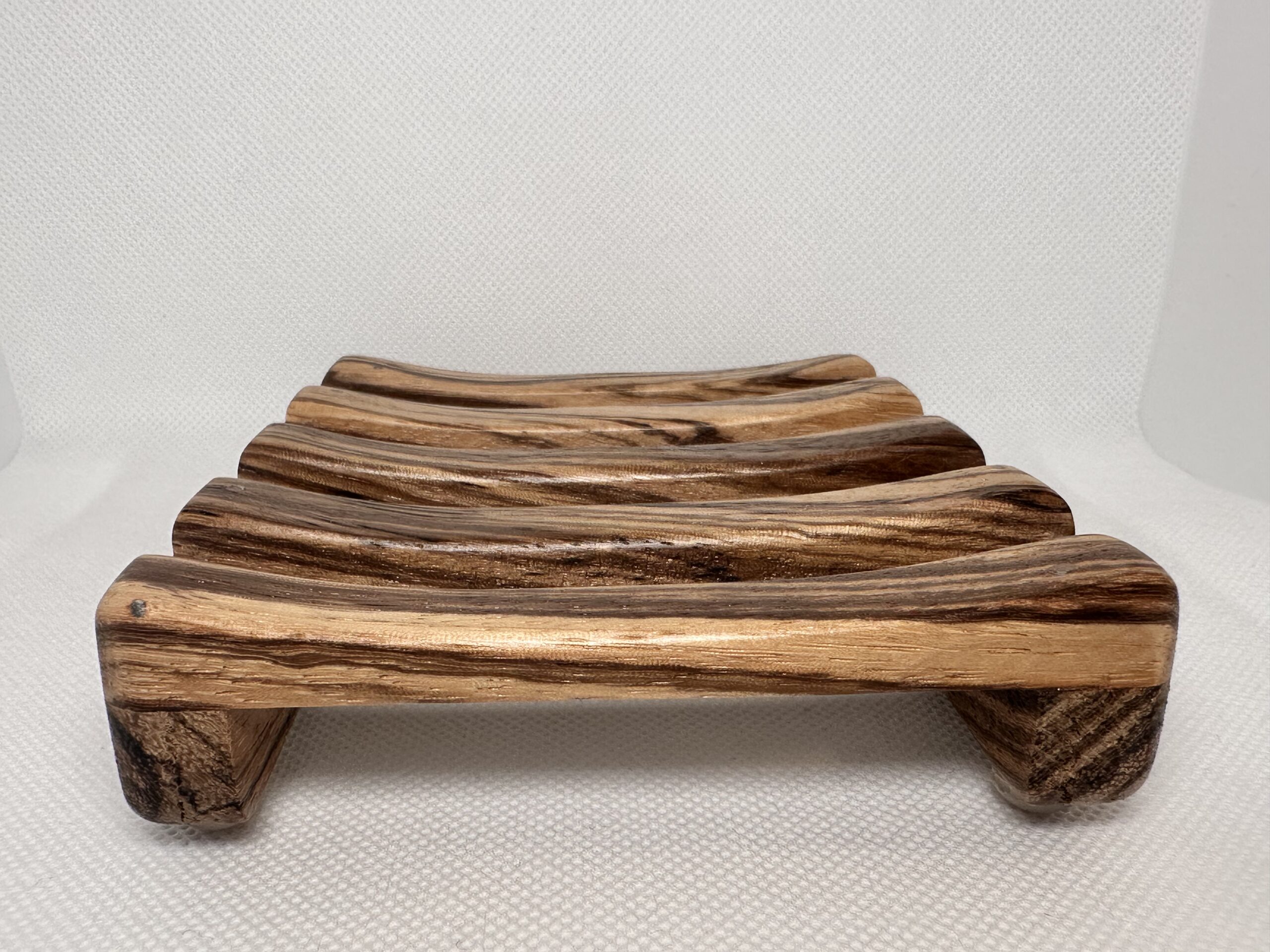 Handcrafted from zebra wood with a slatted design, this soap dish brings natural warmth and function to your space, with a slight in the finish. Measuring 4.75″ x 4″. Sleek curve and smooth finish will add an artisanal touch to your sink or shower.