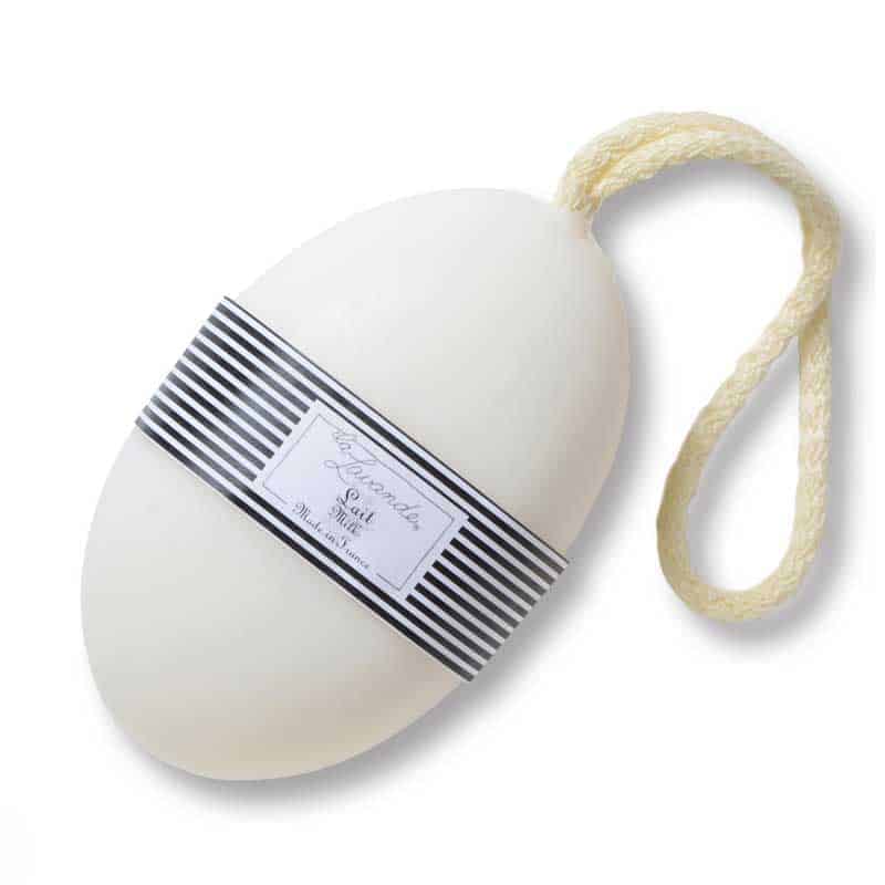 This convenient oval shape soap fits comfortably in your hand. It is enriched with shea butter and is lightly scented – “Milk”. The 200 gr (7 oz) bar is mild, nourishing and long-lasting, dries quickly so it lasts longer! It is packaged in a clear cello bag and tied with raffia. Made in France. Experience luxury every day with this refreshing scented soap. The rope loop is approximately 5″ long.